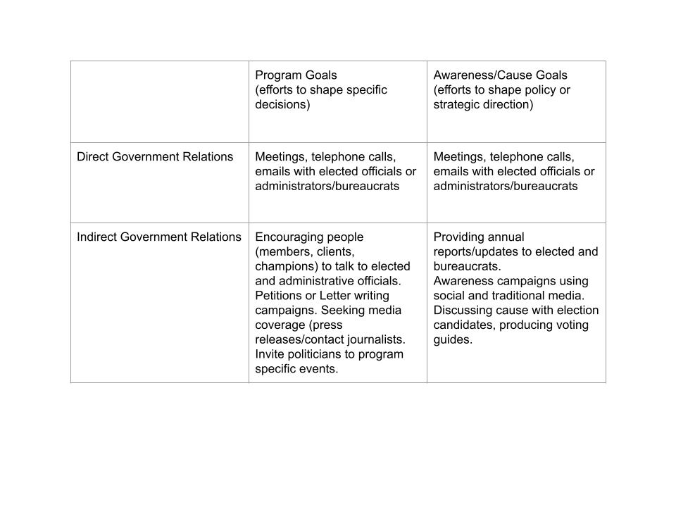 1. Talking to politicians (elected officials) or bureaucrats (appointed officials or government employees) about a program you offer or a funding application to improve your chance of success.